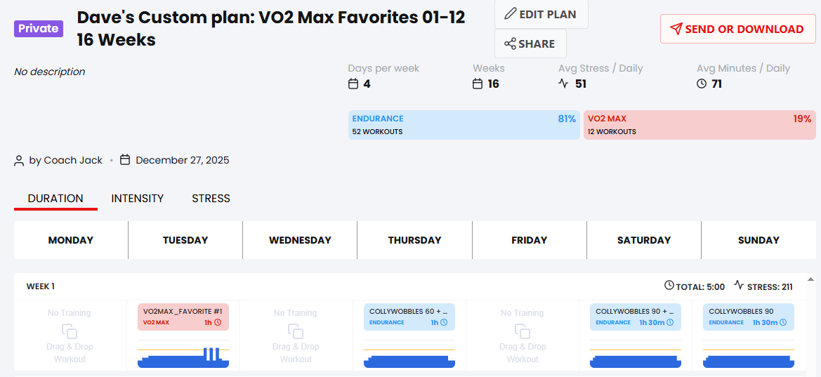 This almost 80/20 version of VO2 Max Favorites 01 to 12 results in TiZ as follows: