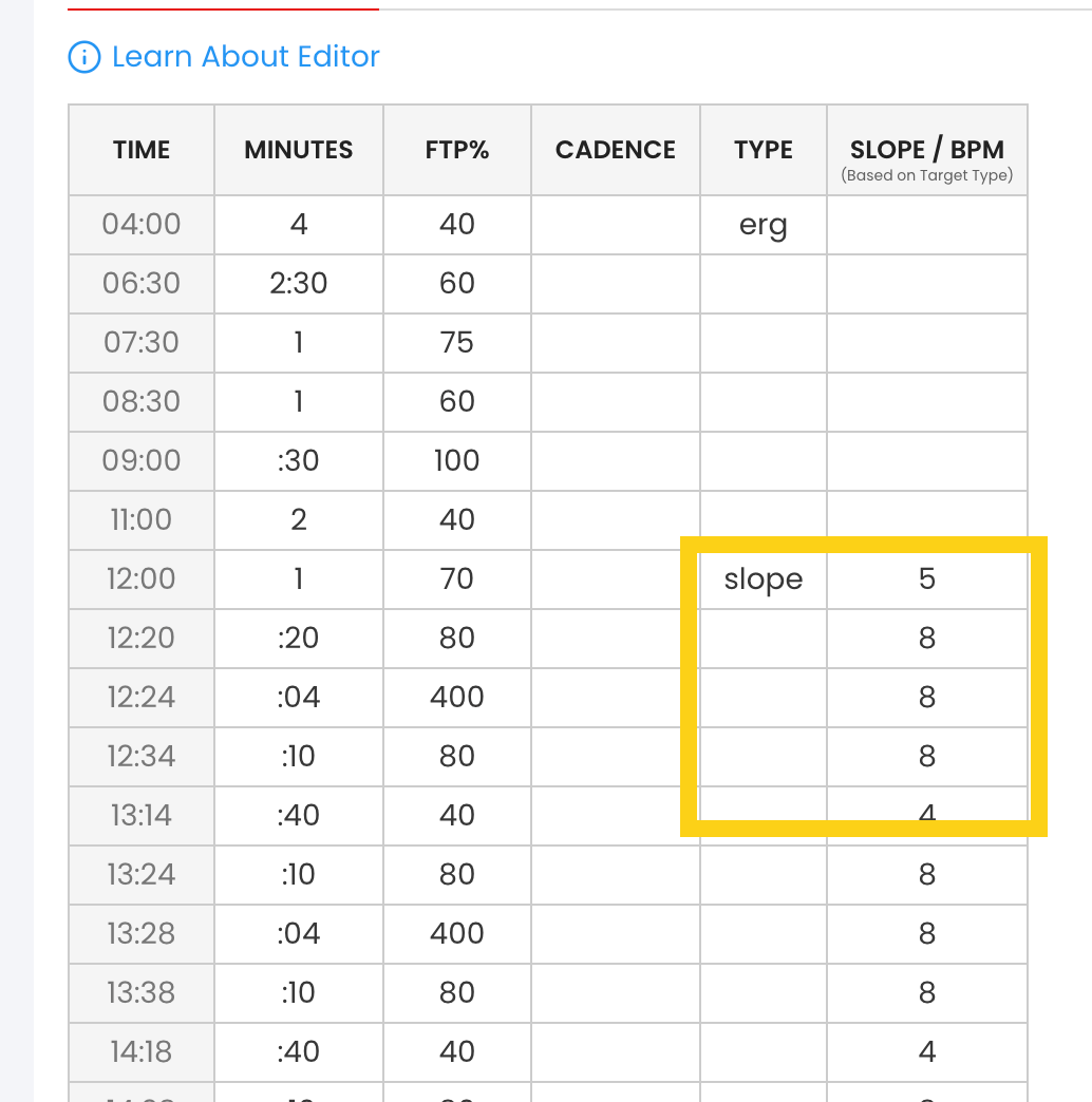 Ah, that looks like a neat feature for building certain workouts. So you can predetermine the slope of each interval? Super cool, like an ERG-Mode light, that gives you the freedom to fine tune your power output.