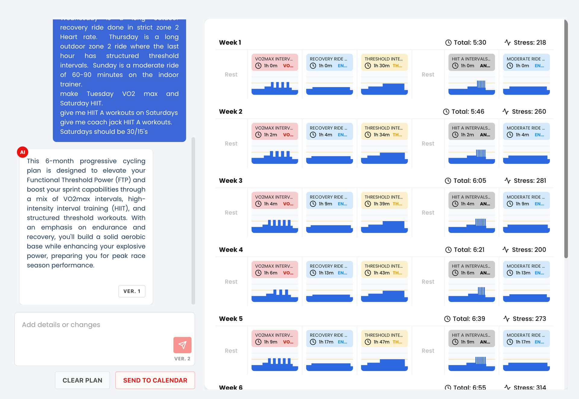 The thing is this AI is not connected to coach jack so you can’t ask for coach jack workouts, or let’s say it wont be the same hit a workouts. It looks pretty good but not sure this is the plan you wanted. After you say something you should see a response with a version 1 in this screenshot. now you can go in and ask for adjustments and push to your calendar if you want. After you ask for a change if you don’t see a new version something is going on with your browser or something.