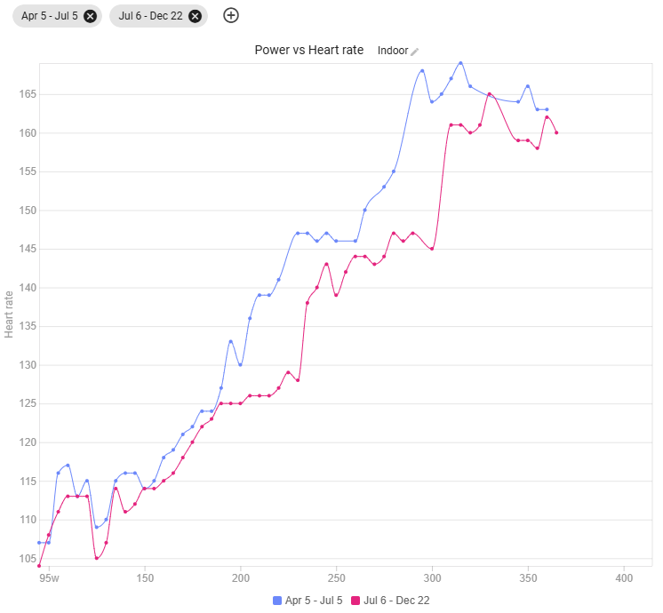 Thats interesting… Strange the divergency at around 125 bpm, is this single workout comparison? The HR at 20 minutes for 5 minutes like @BlackTek does, with consistent protocol and environment… i.e. maf test would be more clear but still the general 20w increase looks great.