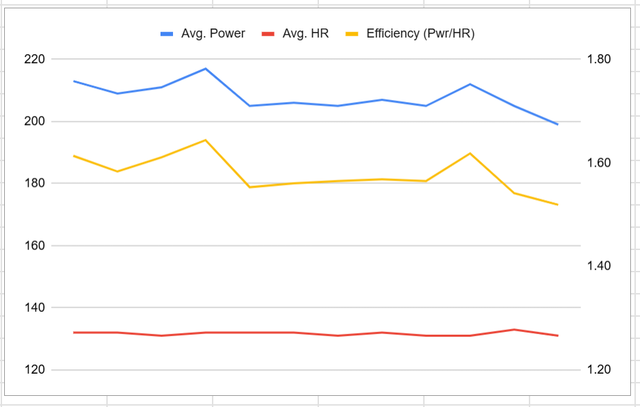 The power in the last 10 minutes went down a bit because I increased the cadence by 5-10 rpm