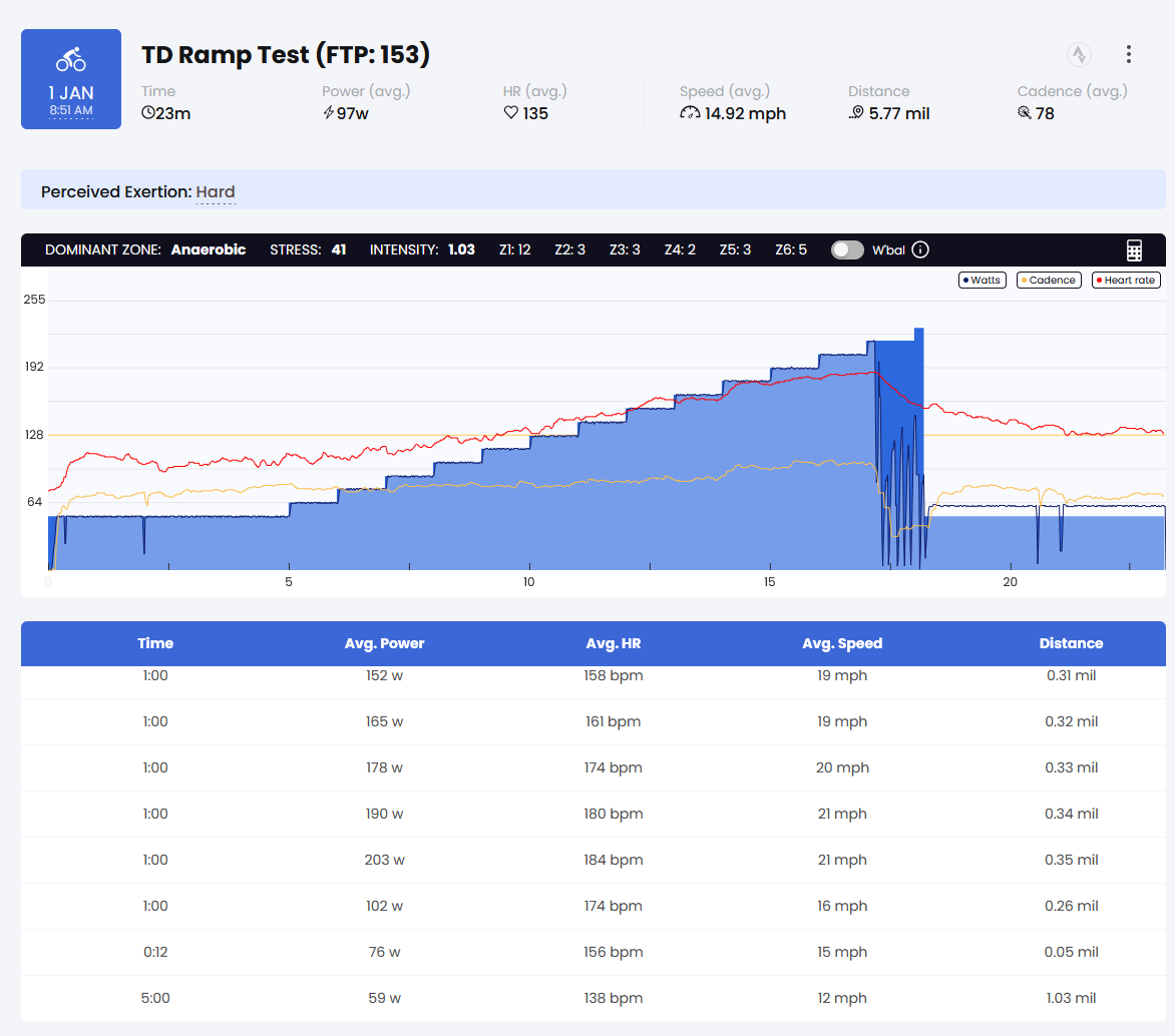 Thanks for the look at that first FTP test! I had sent the workout to my head unit instead of using the phone app for the firs test (My phone was not working at the time). The test didnt automatically end and I thought I was just suppose to try and send it for the whole duration haha.