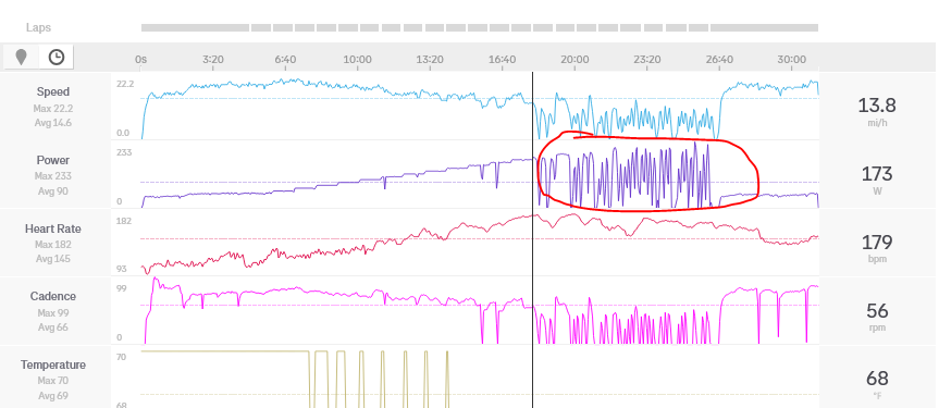 The FTP ramp test graph looks strange. What is the circled stuff? Normally once you “pop” you’re done and you start easy pedaling to recover. It is weird to see power stay near the test maximum for ~ 8 minutes after the test peak.