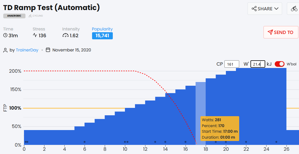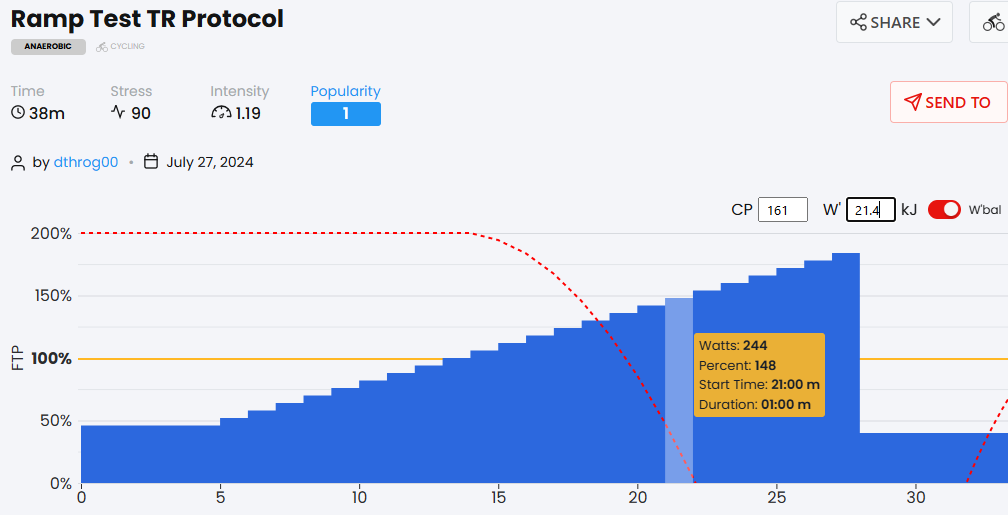 The TD standard ramp rate for my FTP is 10% or about 16 watts. I haven’t done one of these in a while, but I expect FPT would be around 200.