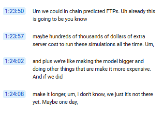 Depending on how this is designed, it doesnât have to be tons of server usage. Meaning they do tons of machine learning to understand, but then ultimately they do rules and maybe run machine learning just on a monthâs worth of data, the user per for each user. So itâs not like theyâre running 300 million activities. They also donât need to process stream data in real time. They can aggregate those metrics. Meaning when a user completes an activity, they can look at the stream data, but thatâs it. My guess is itâs reasonably efficient. LLMs are the brutal thing.