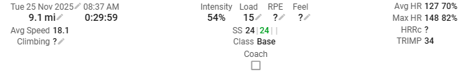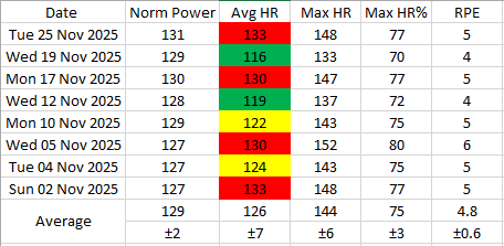 I’ve done a family of workouts 8 times now and the compare activities in Intervals.icu says Avg HR is ±7 BPM and Max HR is ± 6 BPM. That seems like a lot of variation.