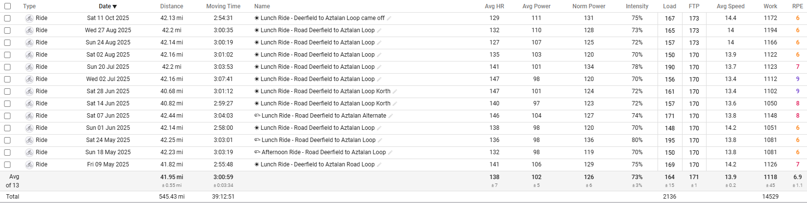 The ride below is the gold standard ride for me. I want to be able to do this and keep RPE of ~ 6 even when it is hot out. I would say that’s the secondary measurement of success.