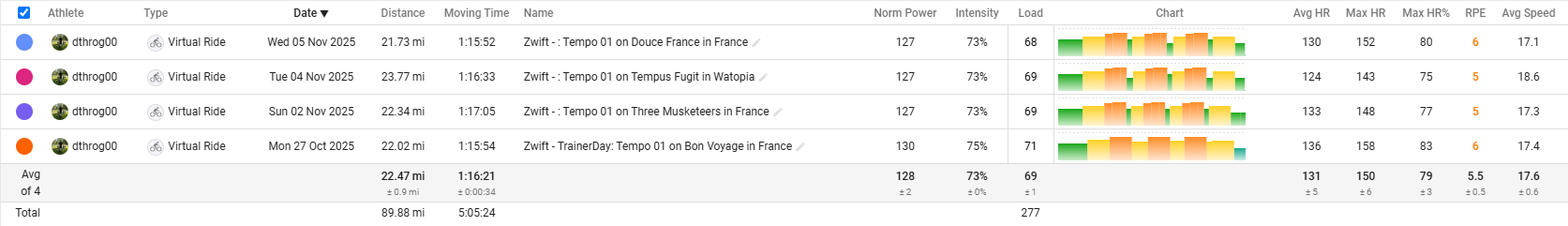 I’ve done the Medio workout 4 times now with intervals.icu compare activity data: