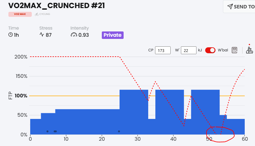 16-wk VO2 Max Crunched #10 to #21 starts with 6x3.5 at 115% with 2 minute rest and ends with 3x8 at 115% with 2 minute rests. I’d estimate that #21 is probably not possible to finish if your FTP is correct.