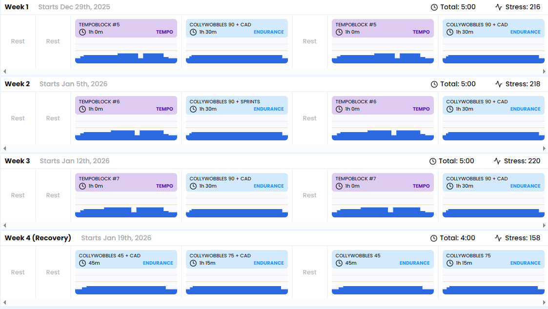 The point is within reason you can get it to do about whatever you want. Sweet Spot Blocks will go as hard as 3x30 at 90%, Threshold Blocks as hard as 2x14 at 100%, HIIT A as hard as 3 sets of 10 40-20s at 140%, etc…