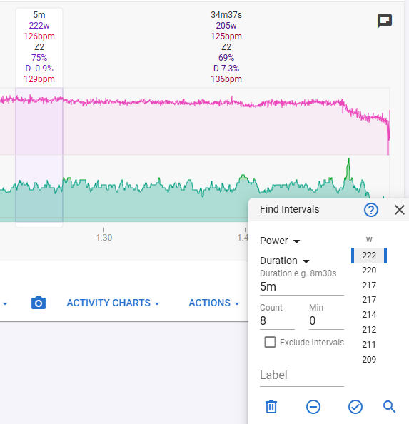 The find intervals function is interesting too. Here I used it to find the highest 5 minute power in a workout. In this case it happens to be from 1h20m44s to 1h25m44s. Decoupling and other data is right there for that interval too.