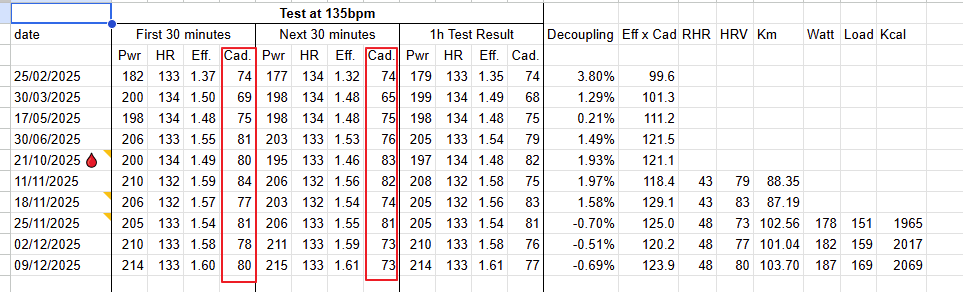 yes I agree that changing the test conditions is not good, but I do those “tests” also as workouts (this is the reason I do 3h 15min). One of my goals (that I’m achieving) is to increase cadence over time.