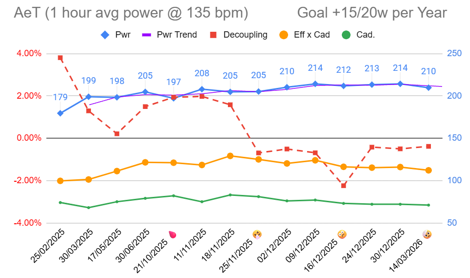I repeated the AeT test at 135 bpm last week, but without good results (210w vs 214w made in December, still with negative decoupling). I hade some little ache at my back (due to too many deadlifts the day before), but I think it was not the main issue.