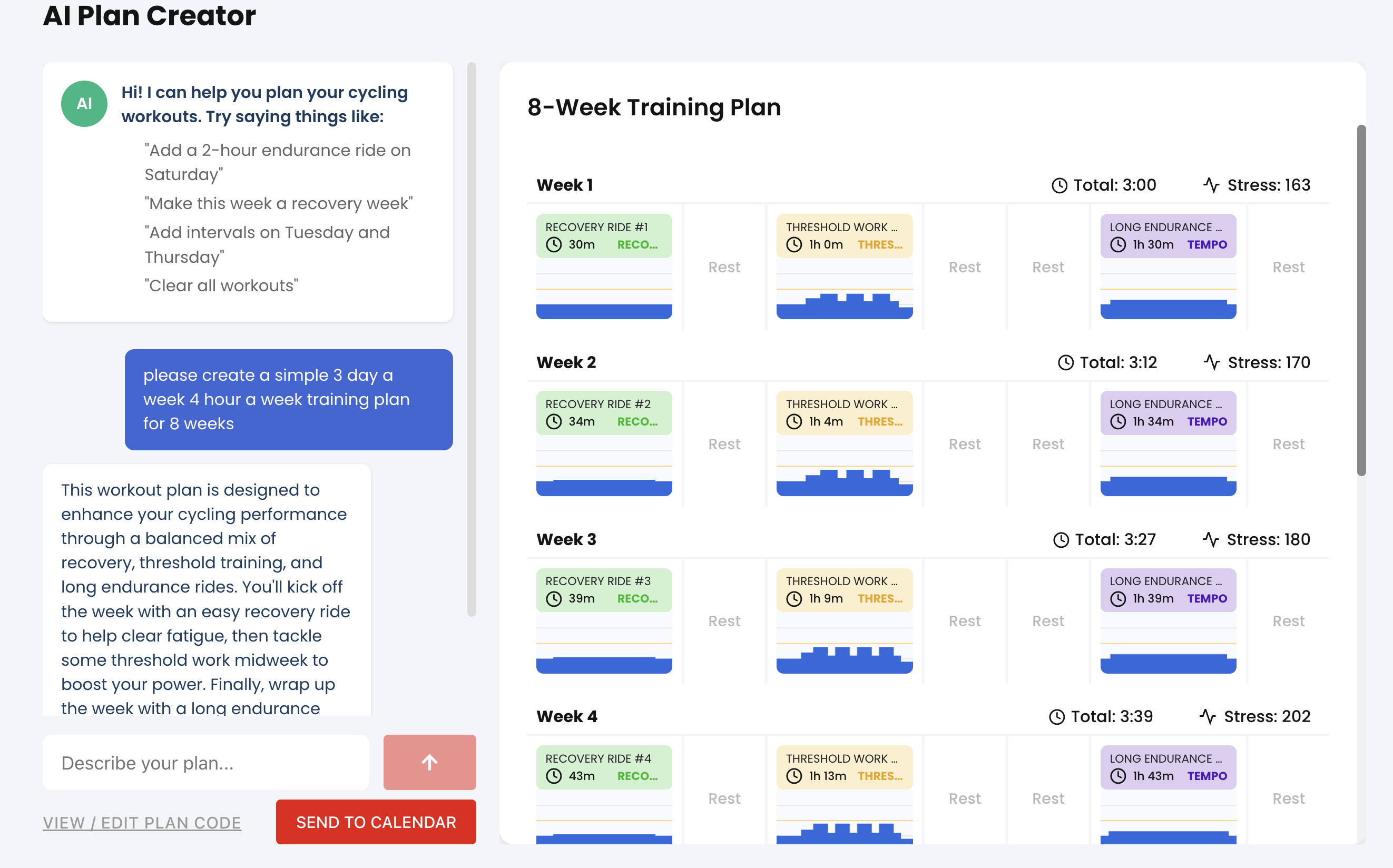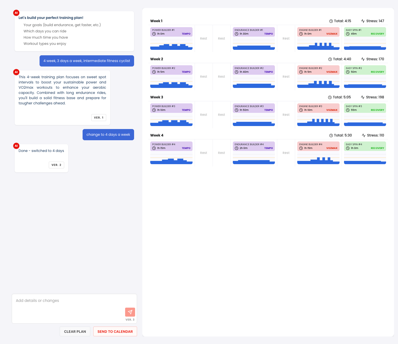 Version 2 is progressing nicely. Obviously below not the best plan description but as you see no reason to use external LLM and you have full control right down to the structure and length of warmup and cool down if you are so motivated. This is just beta UI so it will be nicer than this. But you can just say “change monday from recover to sweetspot and see it in real time”