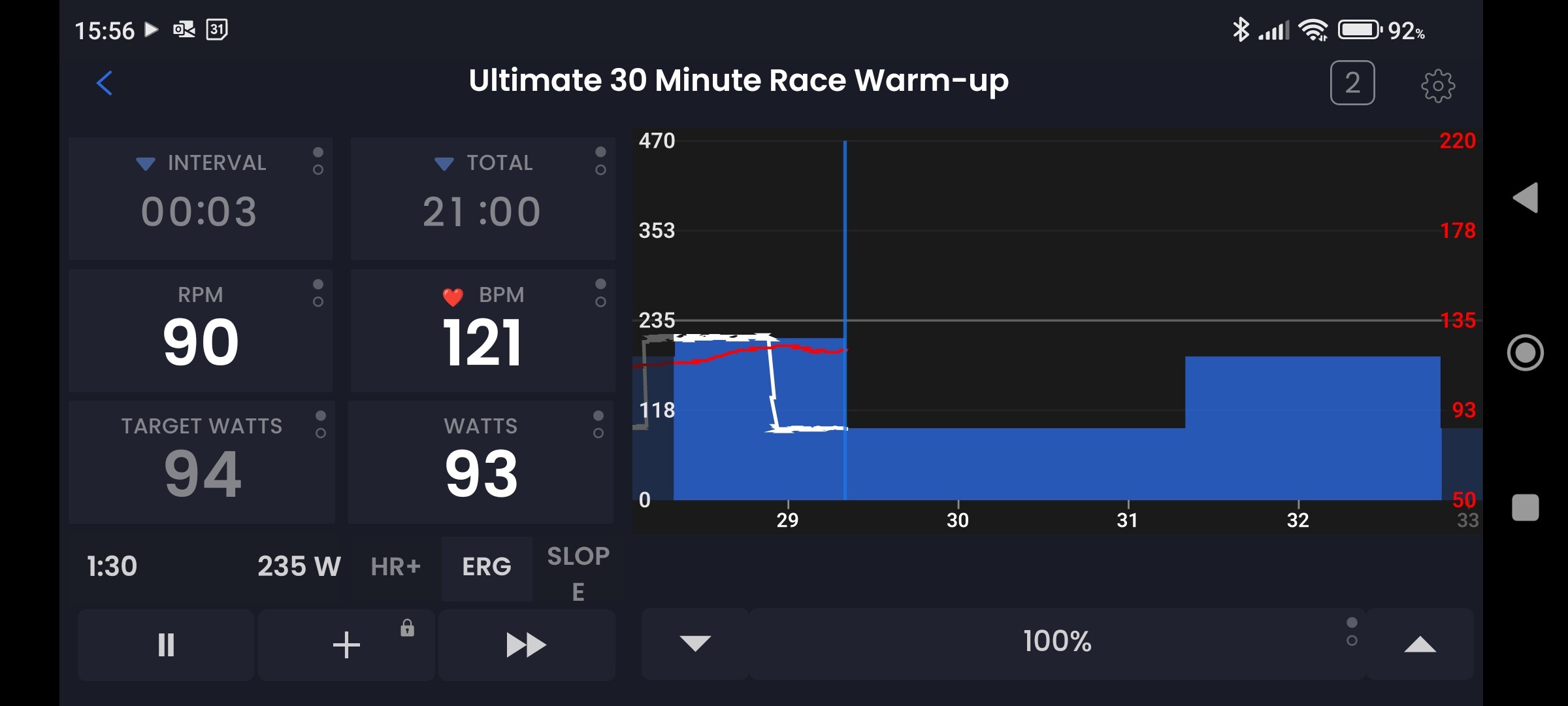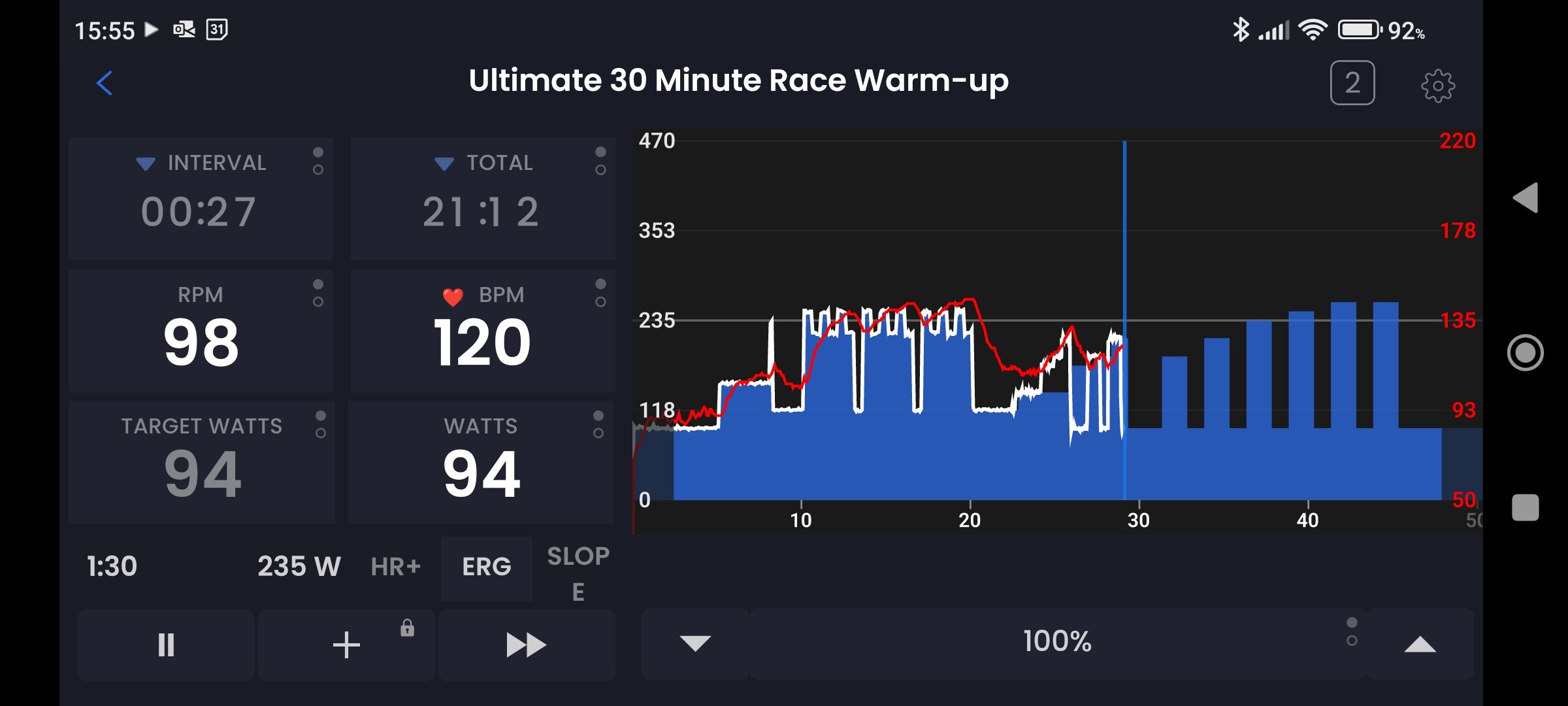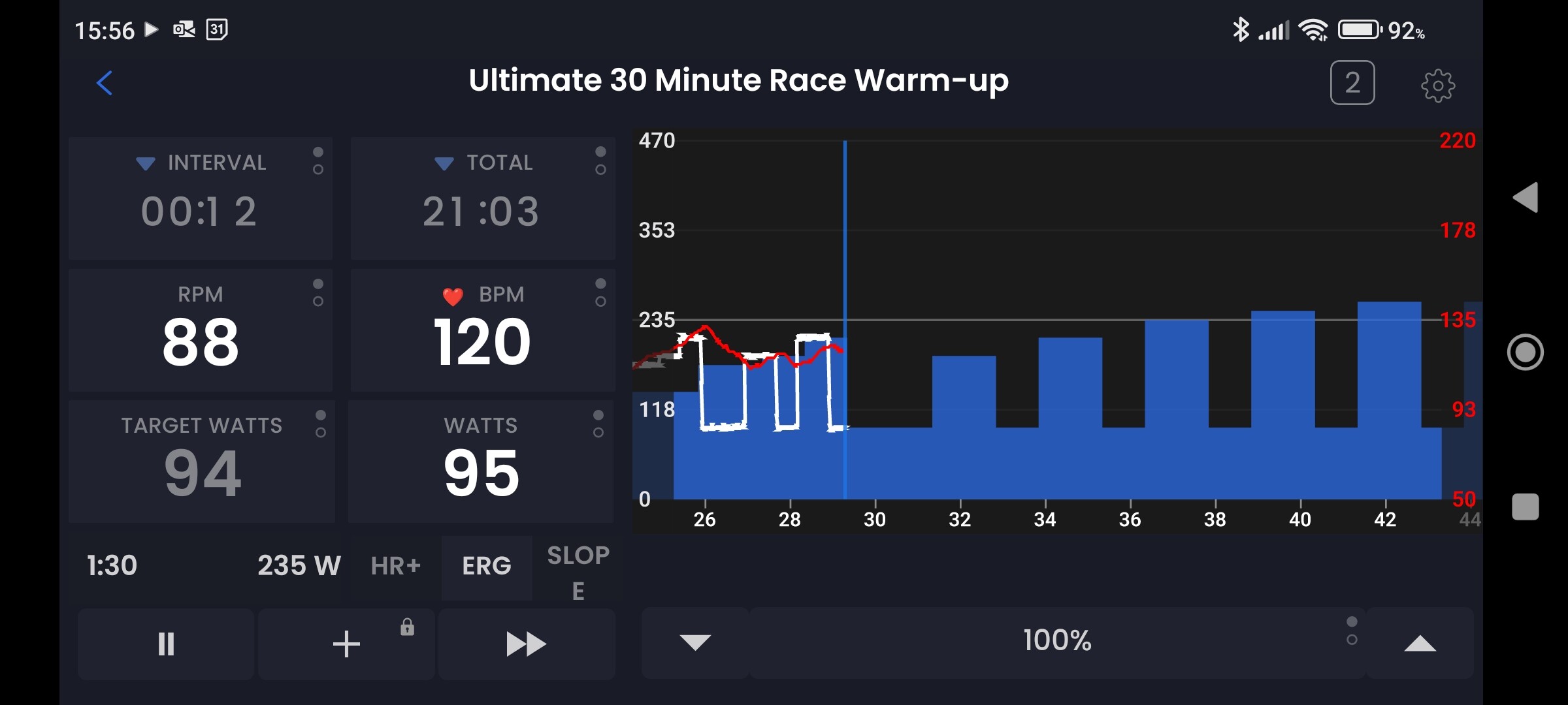 When merging workouts yesterday the historical line tracking Power didn’t track and overlay the second workout’s requirements. The actual power required by the app and turbo was true, so I could complete it all no problem, but the Activity timeline was squashed up, so I lost track of which part I was on (important to know what suffering is coming up!). During the activity the minutes/time at the bottom glitched from one scale to another as it tried to chart where on the second merged workout we were.