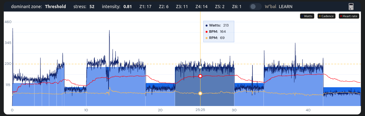 On this threshold session, the intervals were around +20 watts and the rest periods were under by about 20 watts. Erg mode definitely working because if I change gear to try to move back toward target, it pushes me back up. I ended up adjusting down the whole workout to compensate from about halfway through the longer interval which worked although the rest periods were then very low.