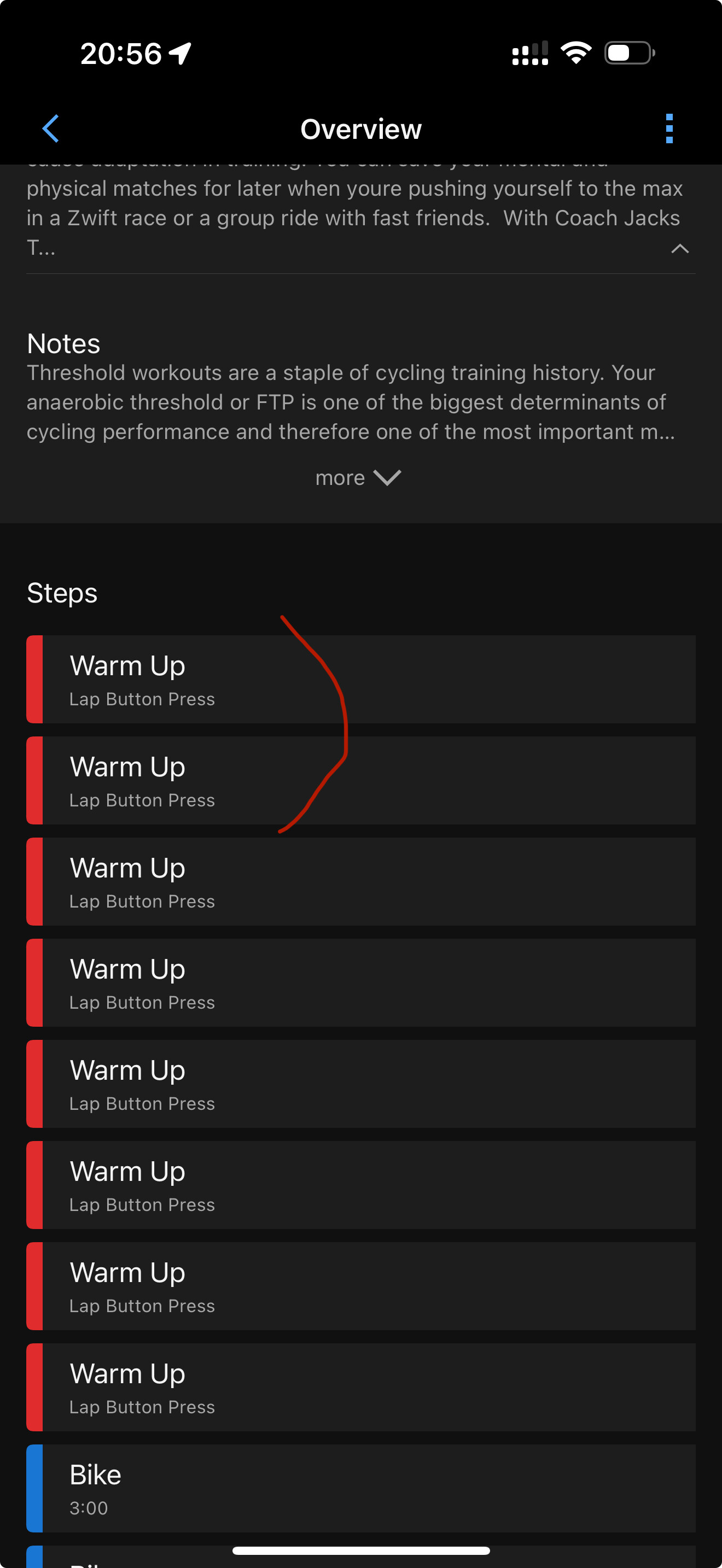 Long story short, synced workouts has warmup sessions without time limit and require lap click to finish it.