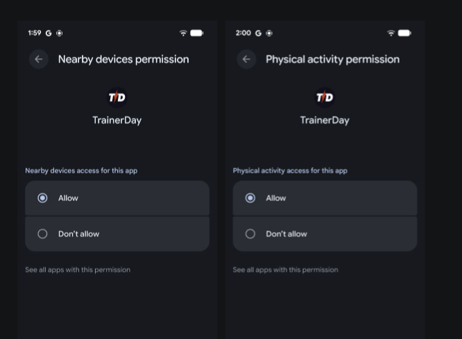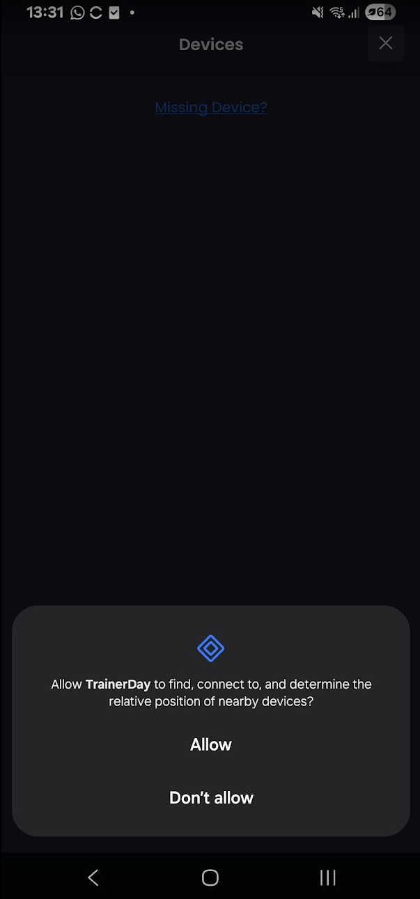 Check all the settings in your play/setttings/apps/trainerday. Mine look like below