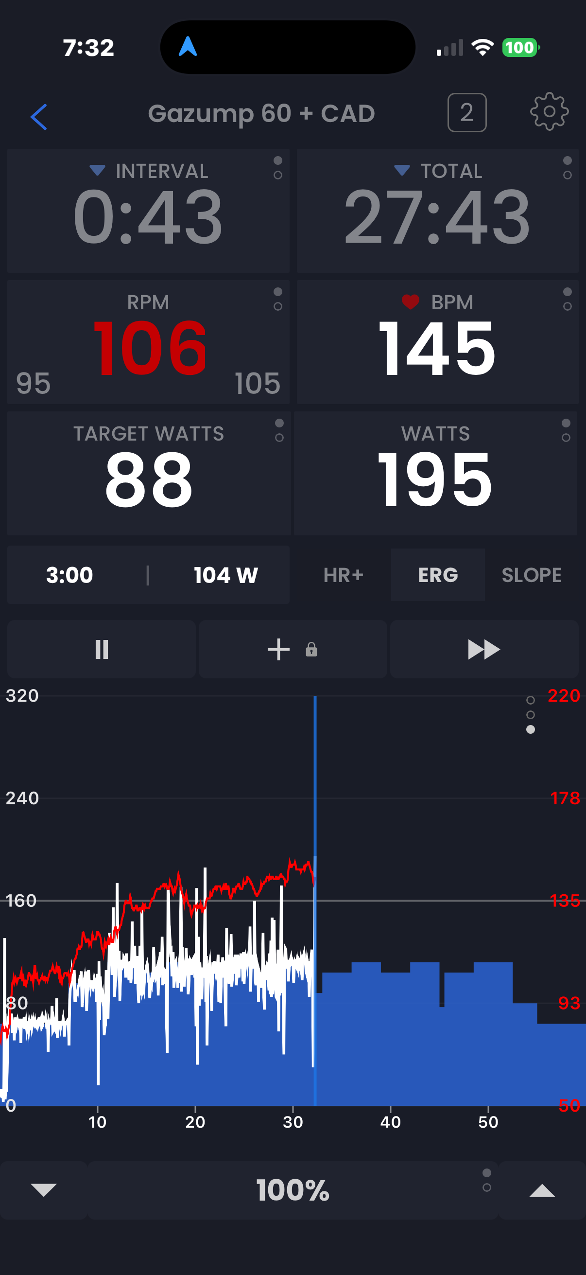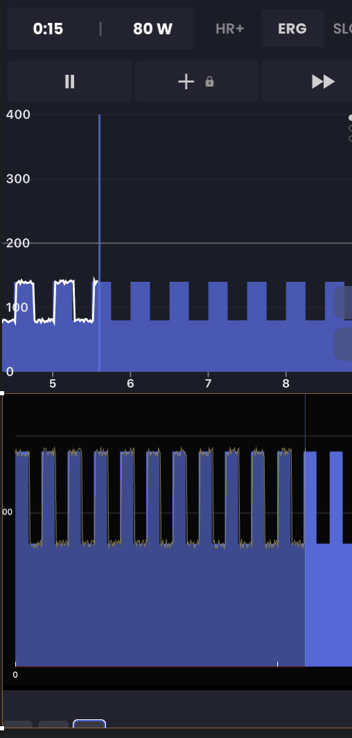 In this image, there’s 10 minutes left in the overall workout, but the lines are showing starting from the far left and show the 2nd set of HIIT inverals.