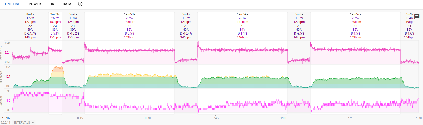 I was gifted an 8w FTP decrease by TrainerRoad AIFTP the day before the first of these workouts (that is what happens when there was no workout above 85% FTP in the prior 28 days).