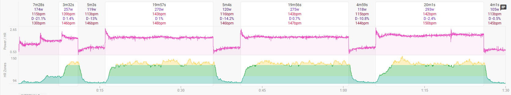 ETA: based on feedback (next post down) from @Alex I added target power to the HR+ controlled sections of the 20 minute intervals.