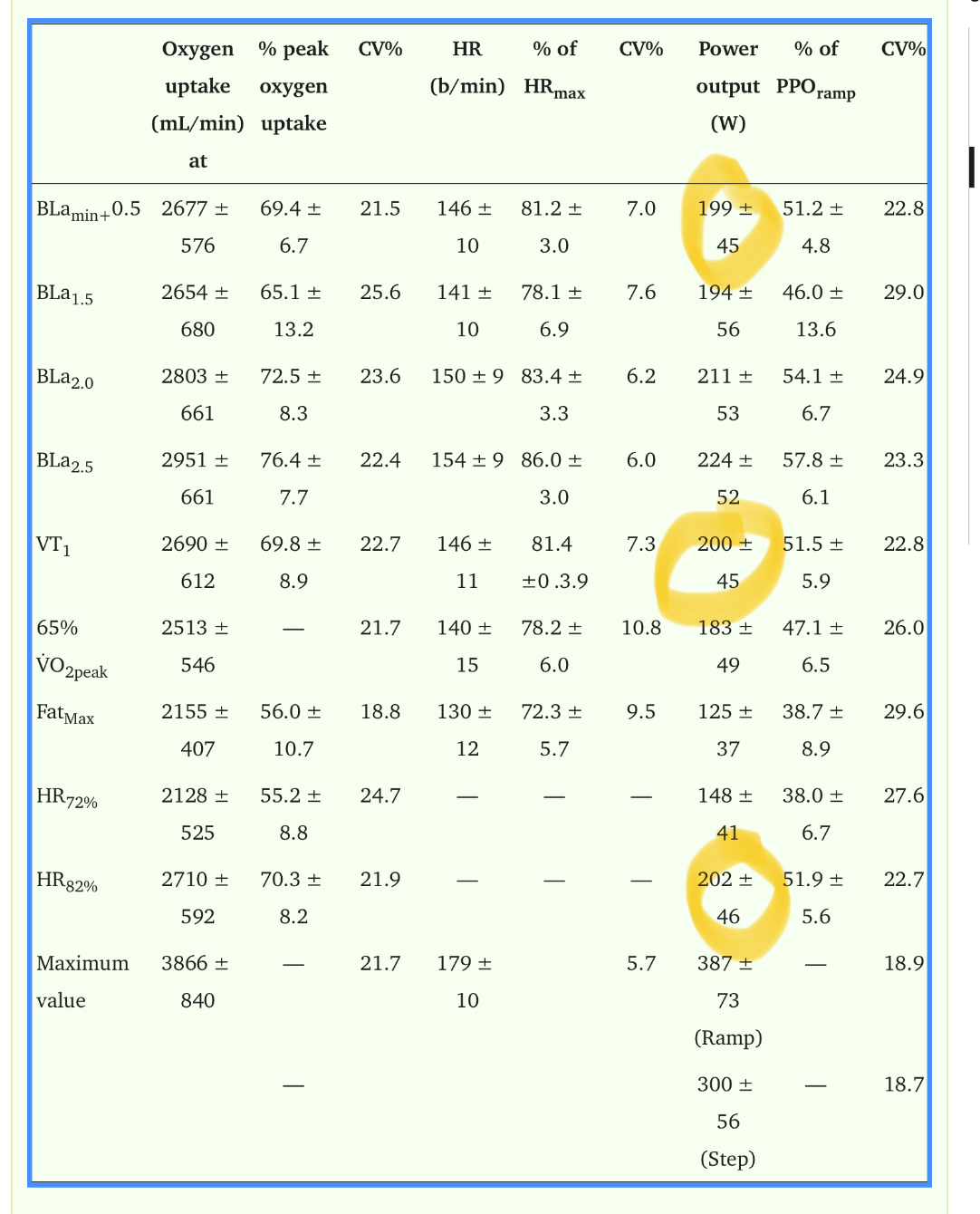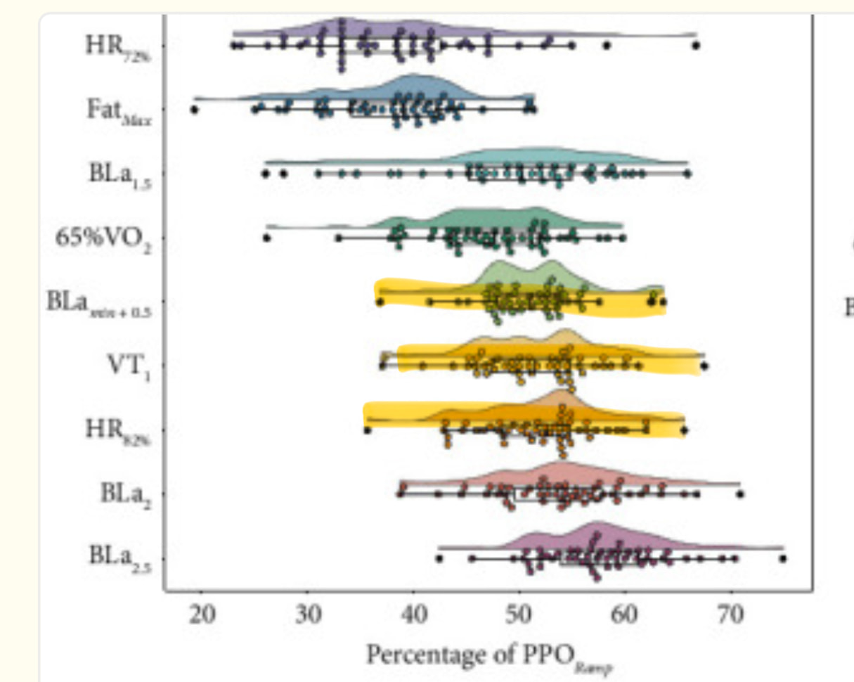 BLamin+0.5, HR82%(max) and VT1 are quite the same, aren‘t they? 200w +/- 45w. So do your workouts below 82% HRmax and you are below your VT1 (As a side mark, here you also see that Fatmax is way below VT1, I come to this again at the end). But ok, let‘s look deeper into it, as a raincloud illustration: