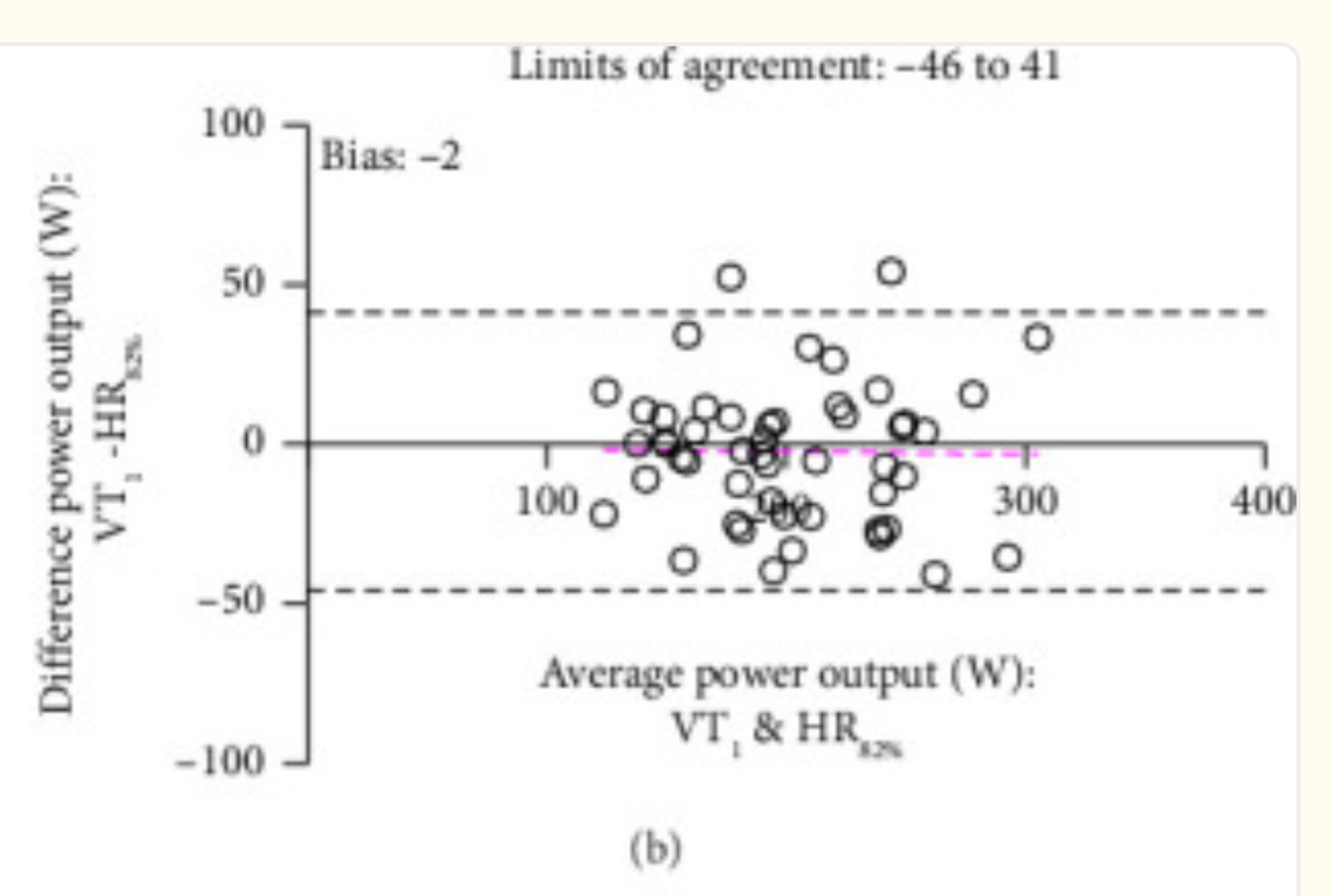 Yes the average difference is 0w. So the average for the whole group is Power(VT1)=Power(HR82). But in reality there are only a couple points (this means only a couple of participants) on the 0w difference line. The whole range is more or less +/-50w difference. So if you train at 82% HRmax, this could be your VT1. Or it‘s 50w less. Or 50w more. Or something in between.
