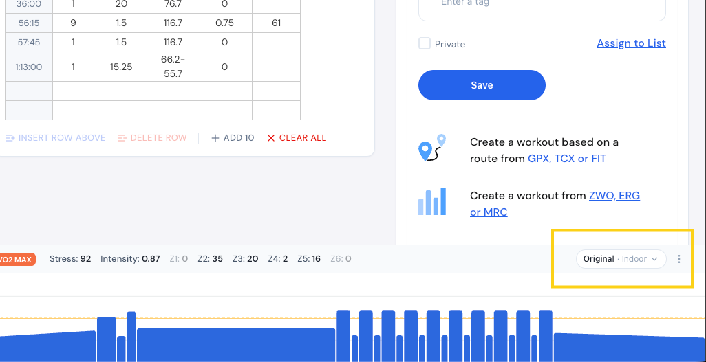 So leave that little switch off so it’s not blue, but then go to the individual workouts and just set it to indoor and then it will always show it correctly or original. See below.