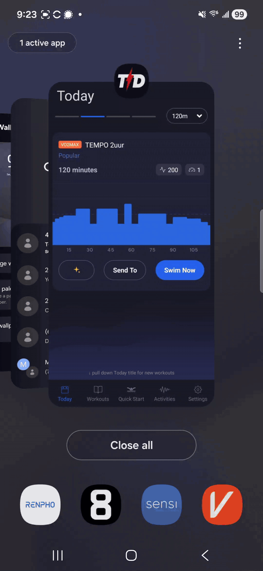 When I’m doing my workout on the Vasa SwimErg (not sure if relevant what device i’m using) on my Samsung Galaxy S24, every couple of minutes I get pulled out of my workout screen into the “Today” screen. I will see a brief “Refreshing” popup. I will press the glowing green “Continue” button to go back to my workout, but I will continue to get interrupted. Sometimes it happens several times in rapid succession: I will go back to my workout screen and then “Refreshing” will pop up again immediately and I will get pulled back into the “Today” screen. This might happen several times in rapid succession.
